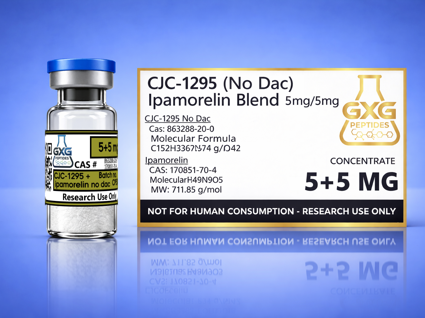 GXG Peptides manufactures CJC-1295 (No DAC) + Ipamorelin 10mg under stringent quality standards with verified purity and consistency to ensure reliable scientific outcomes. Each vial is prepared for precise measurement and professional handling in laboratory environments.