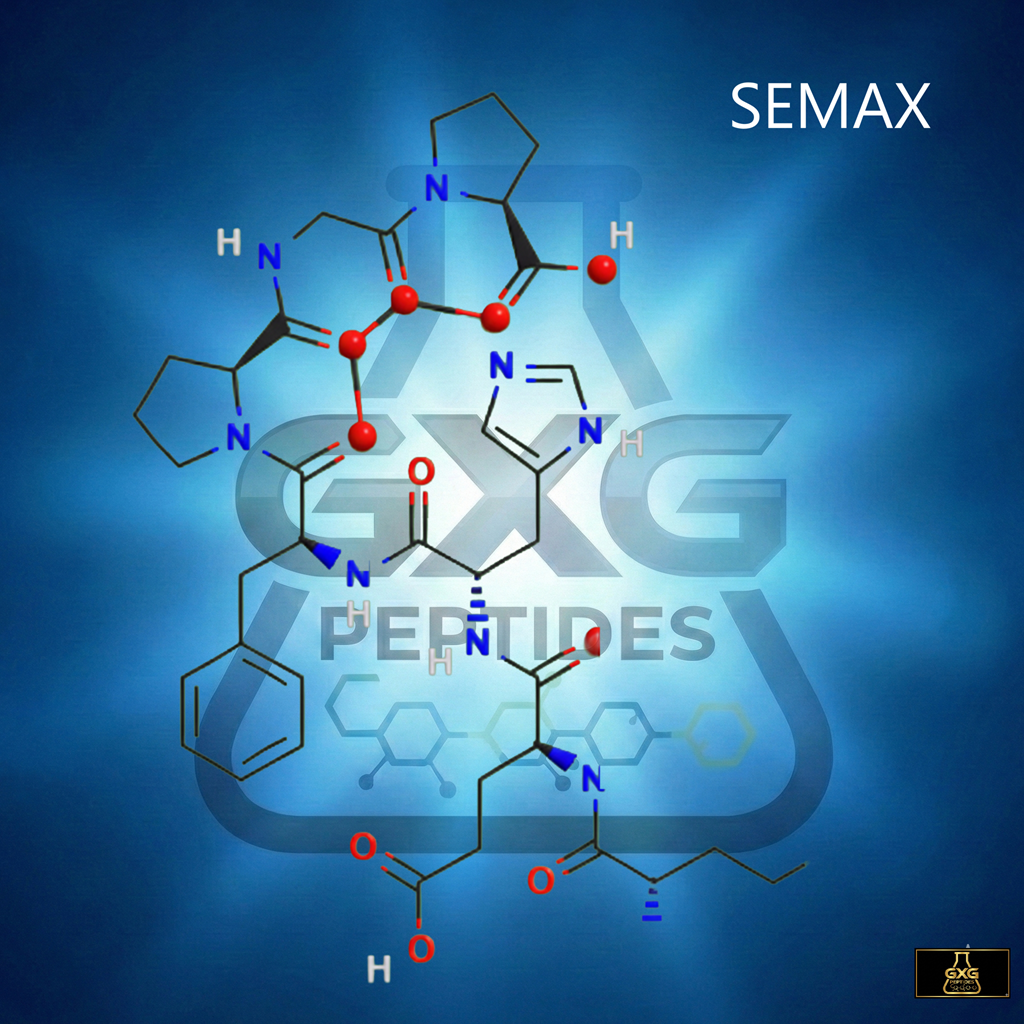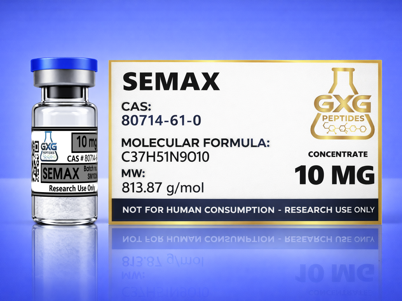 SEMAX is a synthetic peptide derived from a fragment of adrenocorticotropic hormone (ACTH), engineered to support stability and targeted activity within the central nervous system. Widely studied in neurobiology and cognitive research, SEMAX has gained attention for its potential role in brain signaling pathways, neurotrophic factor expression, and overall cognitive function. GXG Peptides offers SEMAX 10mg as a high-purity research material intended for controlled laboratory investigations into memory, focus, and neurological resilience.